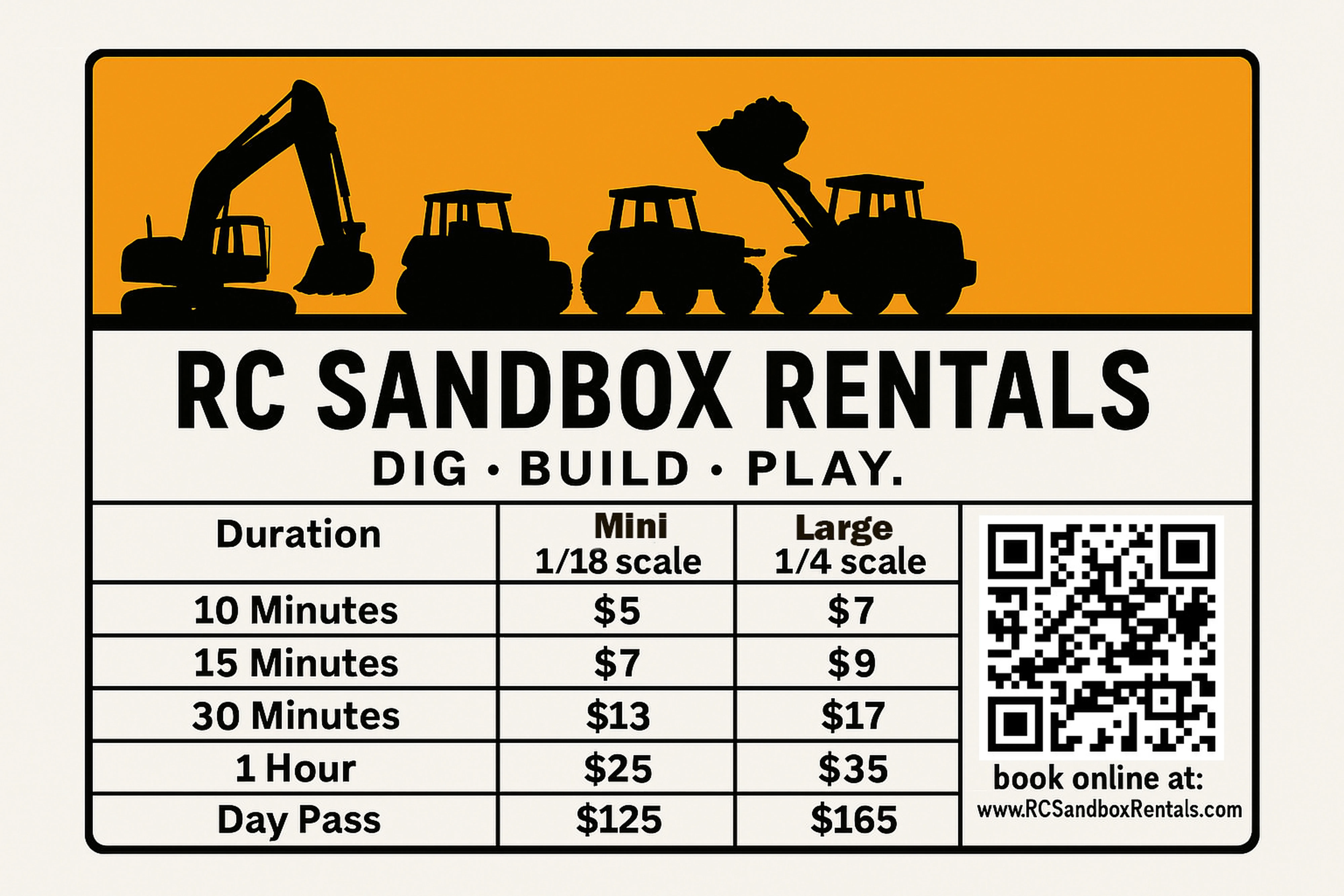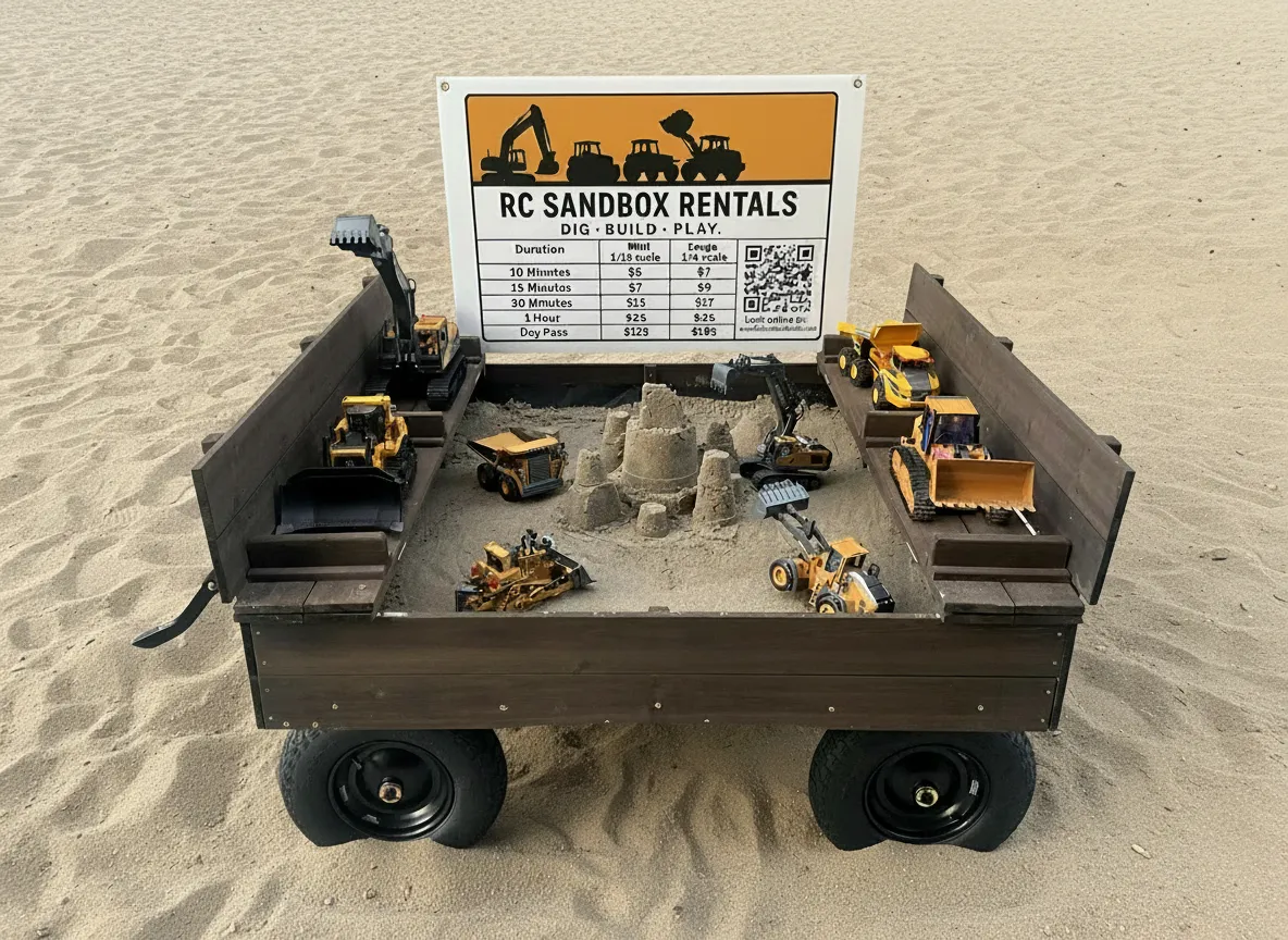 Sandbox Rentals is a mobile, beachside entertainment business that rents and sells remote-control (RC) construction vehicles — such as excavators, dump trucks, bulldozers, and loaders — for use in real sand play areas. Customers can rent them by the minute, hour, or day, and operate them in a designated sandbox or open sand area.